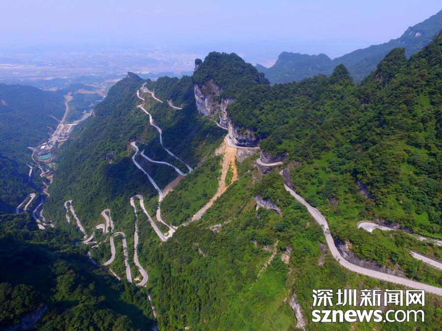 天門山盤山公路位于湖南省張家界市境內的國家森林公園天門山上,盤山公路全長10.77公里,海拔從200米急劇提升到1300米,大道兩側絕壁千仞,空谷幽深,共計99個彎,180度急彎此消彼長,似玉帶環(huán)繞,航拍鏡頭下蜿蜒曲折的道路彎彎緊連,層層迭起,宛如迷宮般的“納斯卡線條”,被譽為“天下第一公路奇觀”,同時它也是世界上最危險的十大公路之一。