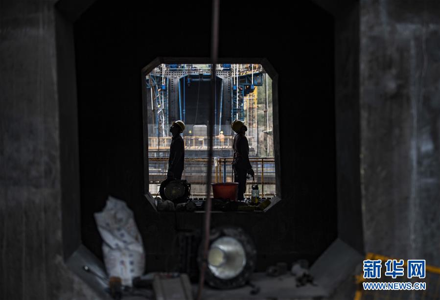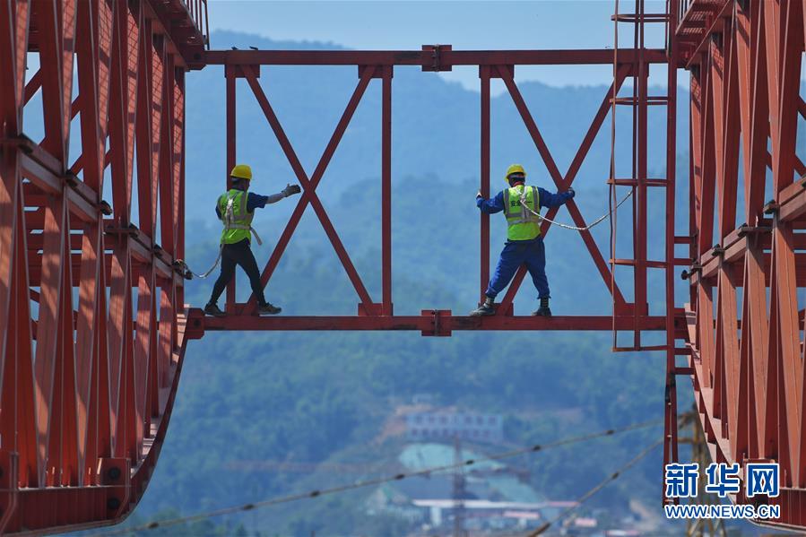 4月8日,兩名中鐵四局職工安裝架設鋼桁梁,每節鋼桁梁間的精度需要達到毫米級才能保證安裝到位。新華社記者江文耀攝