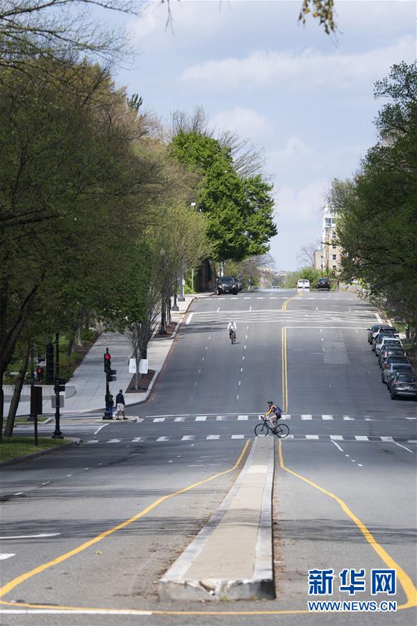 4月8日,在美國首都華盛頓,市民在空曠的街道上騎行。美國約翰斯·霍普金斯大學8日發布的新冠疫情最新統計數據顯示,美國確診病例超過40萬例。美國目前是全球確診病例最多的國家。數據顯示,截至美國東部時間8日12時30分(北京時間9日0時30分),美國新冠確診病例升至401166例,死亡12936例。新華社記者劉杰攝
