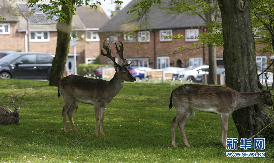 4月8日,在英國倫敦東部一個居民區,附近公園里的鹿在草坪上駐足。隨著新冠疫情在英國的擴散,政府要求人們減少不必要的外出。倫敦東部一個居民區附近公園里原來散養的鹿紛紛從公園走出來,或吃草或接受附近居民的喂食,成為特殊時期居民區里的新“客人”。新華社記者韓巖攝