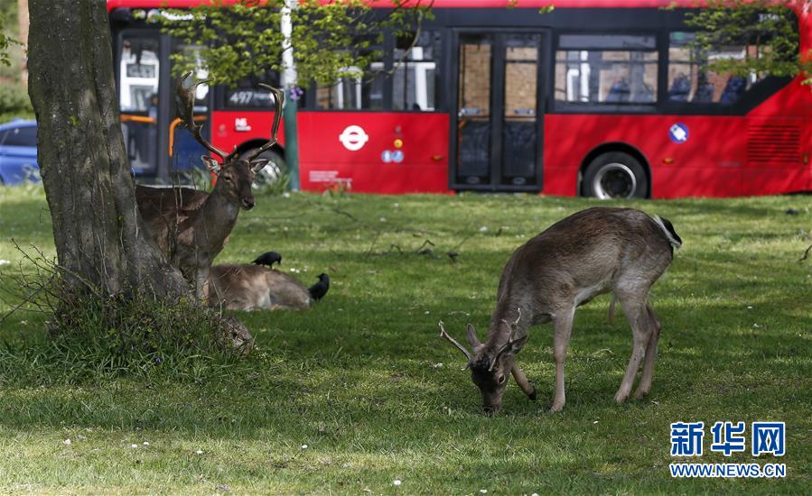 4月8日,在英國倫敦東部一個居民區,附近公園里的鹿在草坪上吃草。隨著新冠疫情在英國的擴散,政府要求人們減少不必要的外出。倫敦東部一個居民區附近公園里原來散養的鹿紛紛從公園走出來,或吃草或接受附近居民的喂食,成為特殊時期居民區里的新“客人”。新華社記者韓巖攝