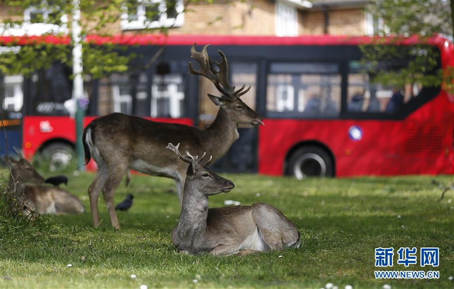 4月8日,在英國倫敦東部一個居民區,附近公園里的鹿在草坪上休息。隨著新冠疫情在英國的擴散,政府要求人們減少不必要的外出。倫敦東部一個居民區附近公園里原來散養的鹿紛紛從公園走出來,或吃草或接受附近居民的喂食,成為特殊時期居民區里的新“客人”。新華社記者韓巖攝