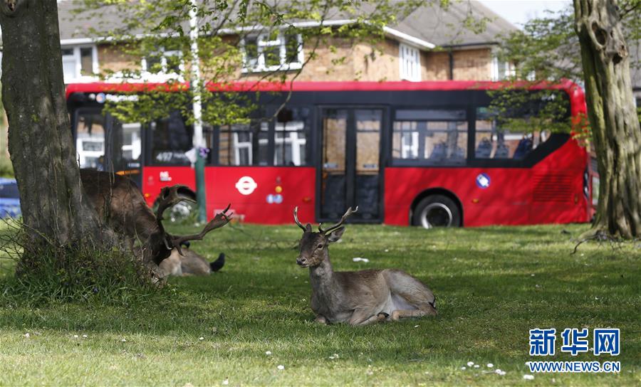 4月8日,在英國倫敦東部一個居民區,附近公園里的鹿在草坪上休息。隨著新冠疫情在英國的擴散,政府要求人們減少不必要的外出。倫敦東部一個居民區附近公園里原來散養的鹿紛紛從公園走出來,或吃草或接受附近居民的喂食,成為特殊時期居民區里的新“客人”。新華社記者韓巖攝
