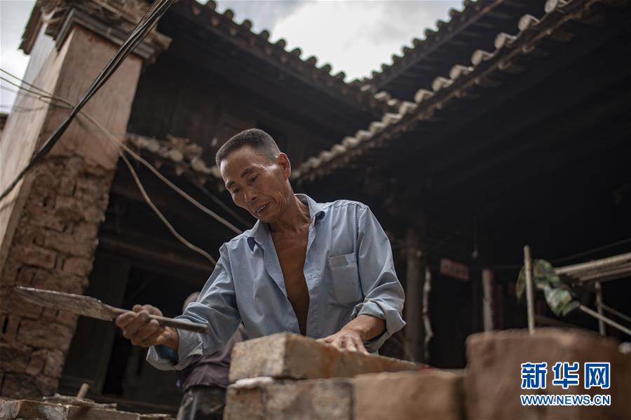 工人王建雄在修繕石屏縣異龍鎮符家營村189號民居的圍墻(8月8日攝)。新華社記者江文耀攝