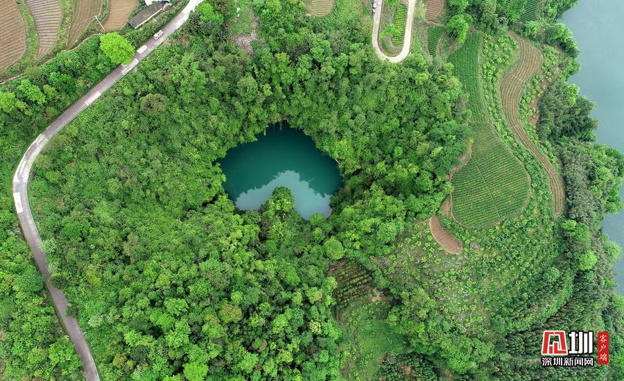2020年4月24日,在湖南張家界市永定區“百里畫廊”茅巖河景區拍攝的“天坑心湖”。(無人機拍攝)當地人稱它“天使之淚”。湖的四周峭壁環繞,屬于喀斯特地貌。由于地形險峻,這里很少有人踏足,一直保持著原始生態面貌。