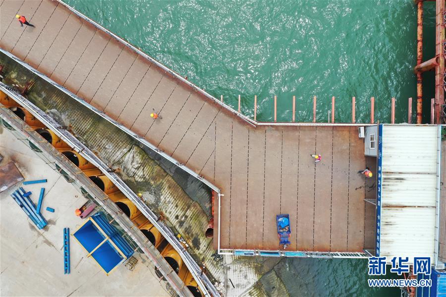 4月25日,幾名工人從海上生活區前往工地(無人機照片)。