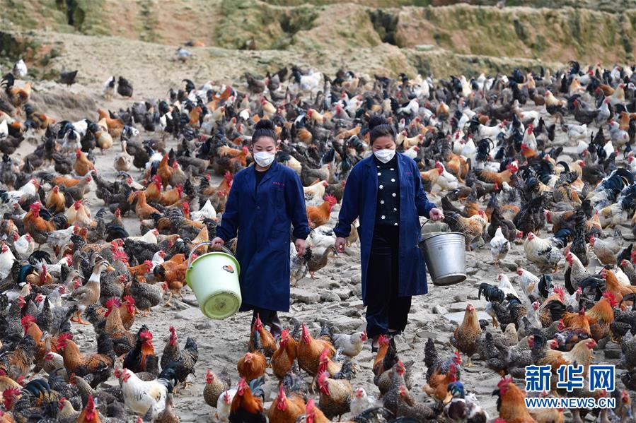 在廣西融水苗族自治縣香粉鄉香粉村,34歲的吳春穎(右)和妹妹吳冬仙在養殖場里喂雞(3月14日攝)。