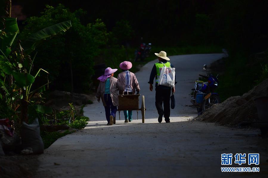 李義成(右)在走訪貧困戶的路上(4月27日攝)。新華社記者黃孝邦攝