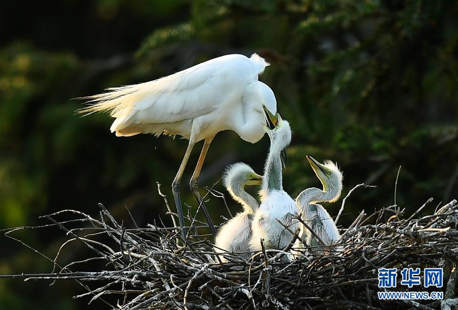 在南昌市新建區象山森林公園內,一只白鷺在鳥巢內給幼鳥喂食(4月27日攝)。近日,在江西省南昌市新建區象山森林公園內,已安家筑巢的大批白鷺進入繁殖旺季。在夕陽的照耀下,白鷺時而翩翩起舞,時而展翅盤旋,構成一幅美麗的自然生態畫卷。新華社記者萬象攝