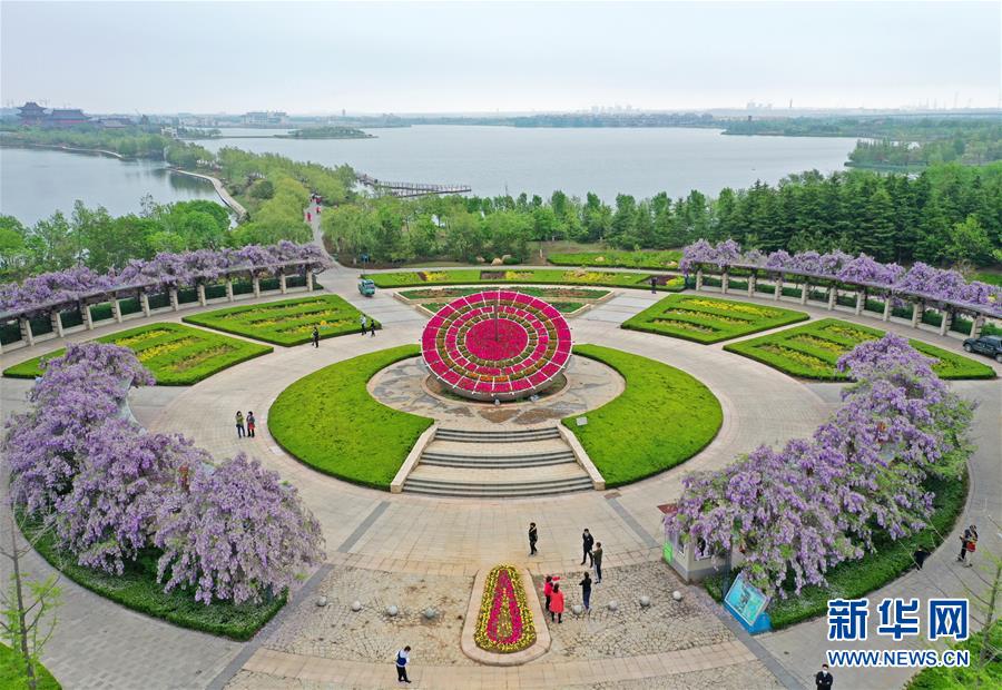 5月2日,游人在位于山東青島膠州市的青島大沽河省級生態旅游度假區賞花游玩(無人機照片)?!拔逡弧奔偃掌陂g,人們以多種方式放松心情、享受假日。新華社發(王昭脈攝)