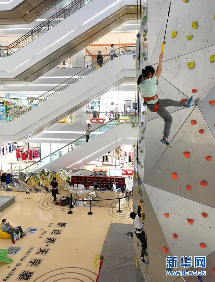 5月2日,小朋友在上海市南京路的一家百貨商場內體驗攀巖運動。“五一”假日期間,人們以多種方式放松心情、享受假日。新華社記者陳飛攝