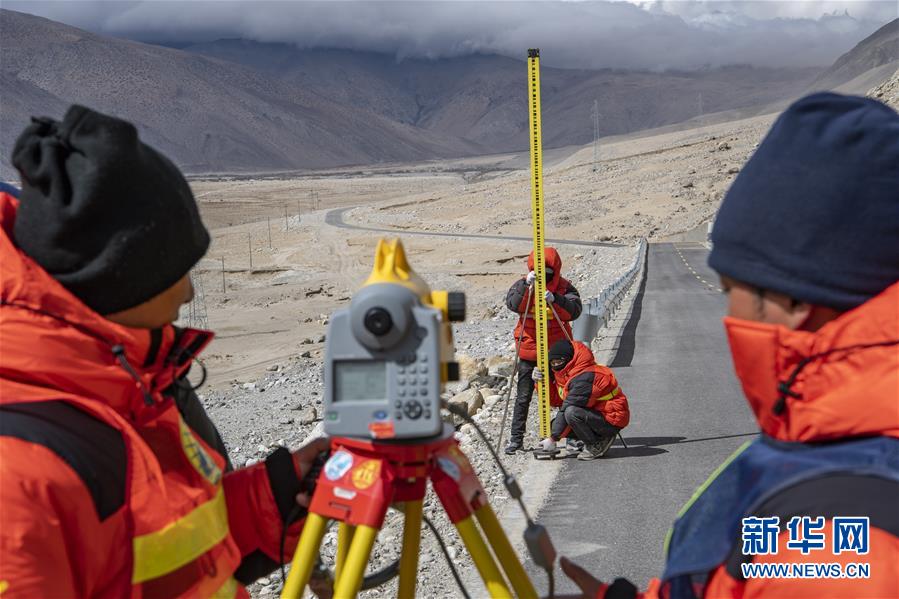 測一大隊隊員在西藏定日縣曲當鄉境內進行水準測量(4月18日攝)。水準測量是一種利用提供水平視線的儀器(如水準儀、水準標尺),測定地面不同點之間的高差,并以此推算高度的一種方法,是經典大地測量的重要技術之一。在目前正在進行的2020珠峰高程測量中,部分國測一大隊隊員承擔了水準測量的任務。新華社記者孫非攝
