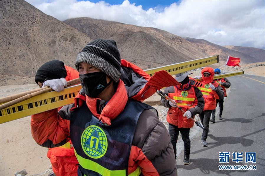 在西藏定日縣曲當鄉境內,國測一大隊隊員前往水準測量點(4月18日攝)。水準測量是一種利用提供水平視線的儀器(如水準儀、水準標尺),測定地面不同點之間的高差,并以此推算高度的一種方法,是經典大地測量的重要技術之一。在目前正在進行的2020珠峰高程測量中,部分國測一大隊隊員承擔了水準測量的任務。新華社記者孫非攝
