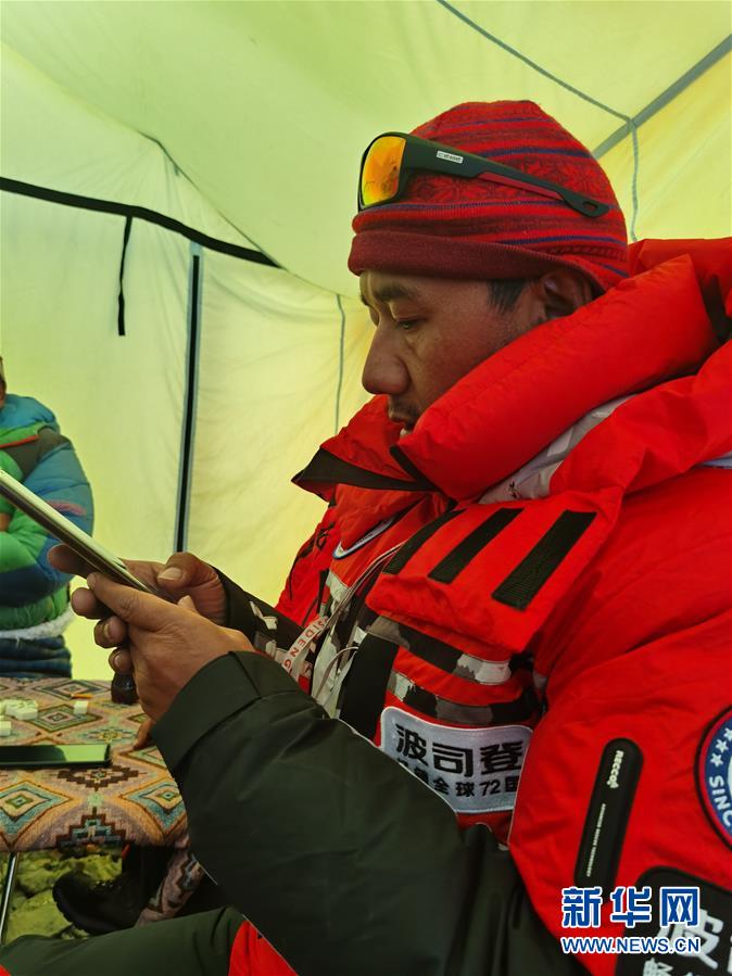 5月7日,登山隊隊長次洛在前進營地查看攀登計劃。當日,2020珠峰高程測量登山隊抵達海拔6500米的前進營地后,測量登山隊同由西藏圣山登山探險服務有限公司的高山向導和協作隊員組成的修路隊、運輸隊召開協調會議,布置下一步任務。新華社特約記者扎西次仁攝