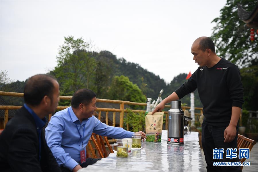 楊正邦(右)在為來自浙江的住客介紹十八洞村種植的“黃金茶”(4月25日攝)。楊正邦1978年出生于十八洞村,在外打工多年。近些年,眼看來十八洞村的游客越來越多,村里越來越熱鬧,楊正邦在2017年結束自己的打工生涯回鄉發展。他先是在村里擺起小吃攤,2018年開起農家樂,去年又搭起新房子擴建成民宿,年度家庭人均純收入從2014年的1923元增加到2019年的7173元。新華社記者薛宇舸攝