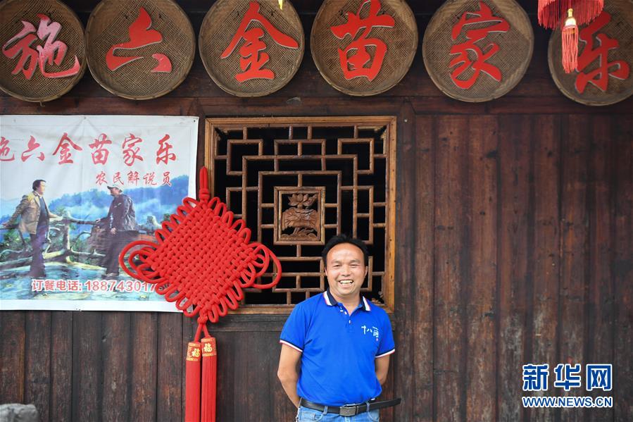 這是施六金在他的農家樂前留影(4月25日攝)。1973年出生于十八洞村的施六金,由于父親患病很早就放棄學業和母親扛起了家庭的重擔。為了生活,他還曾遠去東南亞打工。2015年,看到家鄉的變化,施六金回到村里開起了農家樂,年度家庭人均純收入也從2014年的1715元增長到了2019年的35696元。2018年,施六金與心愛的人組建了家庭。今年初,施六金與愛人迎來了一個大胖小子。“做人做事要懂得回報和感恩。”施六金給剛出生的兒子取名施澤恩。新華社記者薛宇舸攝