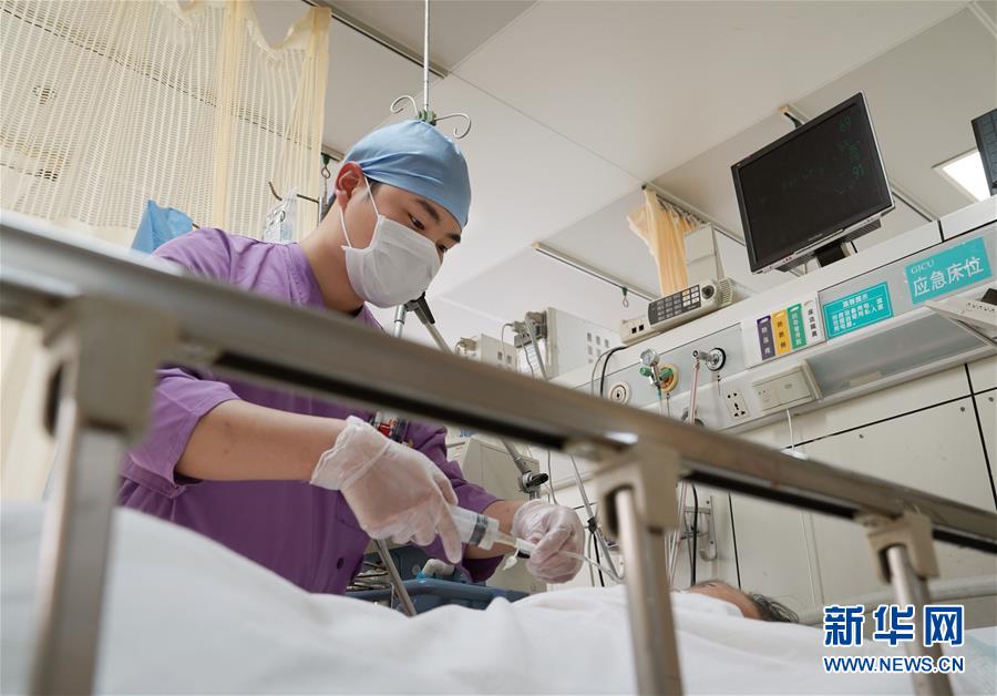 5月10日,在上海市普陀區中心醫院急診重癥監護室內,23歲的護士范磊磊為患者進行鼻飼。男護士團隊中的絕大多數護士是“90后”。