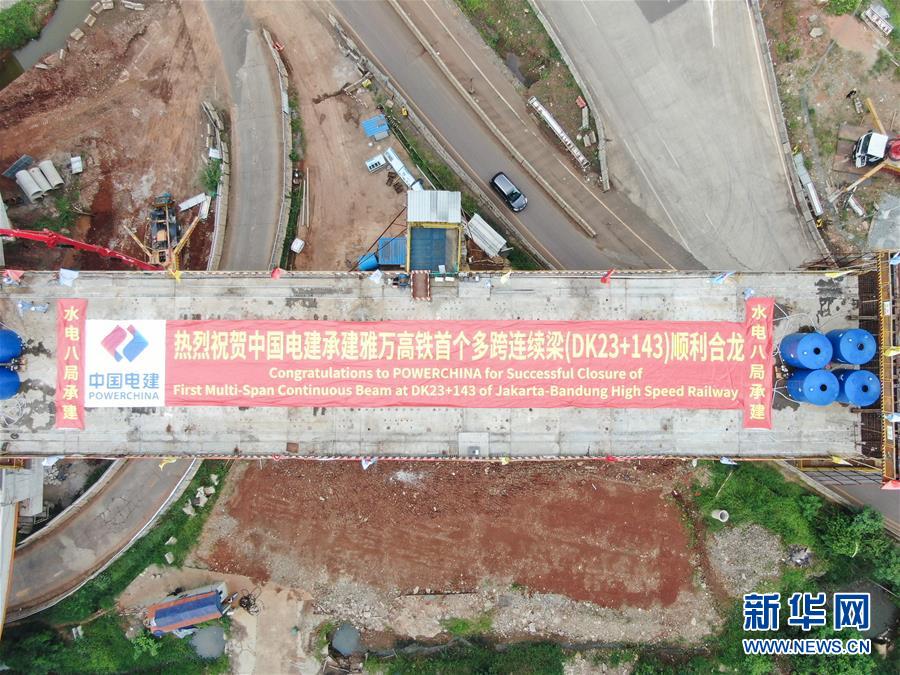 這是5月10日拍攝的印度尼西亞雅萬高鐵2號特大橋施工現場。(無人機拍攝)當日,印尼雅萬高鐵首個多跨連續剛構完成合龍,標志著雅萬高鐵2號特大橋施工進入攻堅建設階段。新華社記者杜宇攝