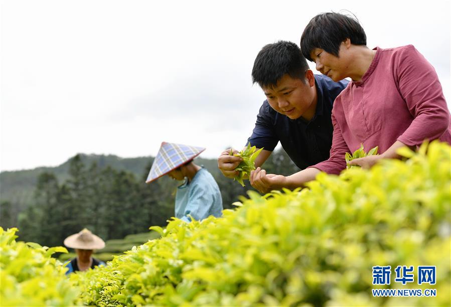 方舟跟著母親游玉瓊(右)學習采摘武夷巖茶中的白雞冠品種(5月10日攝)。新華社記者魏培全攝