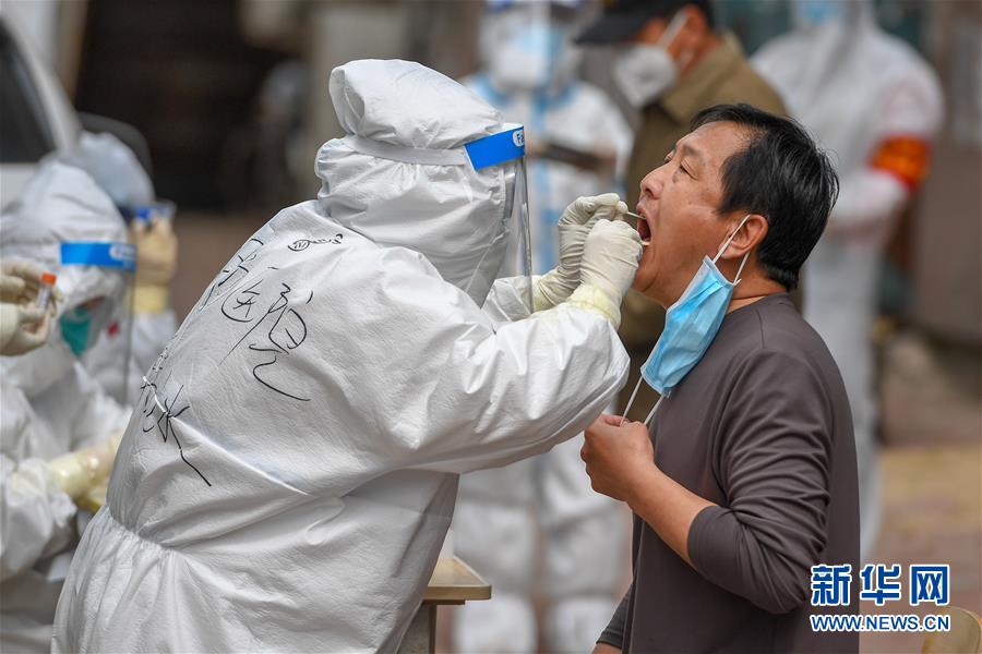5月15日,在舒蘭市建馨園小區,工作人員為居民采集咽拭子。當日,從吉林市7家市直醫院抽調的300名護士經培訓后,全部投入到舒蘭市(隸屬于吉林市)核酸采樣工作中。為提供追溯傳染源所必需的核酸檢測相關數據,舒蘭市根據確診病例的活動軌跡,將流調和核酸檢測范圍擴大至本地確診病例和無癥狀感染者的次密接人員及一般接觸者。新華社記者張楠攝
