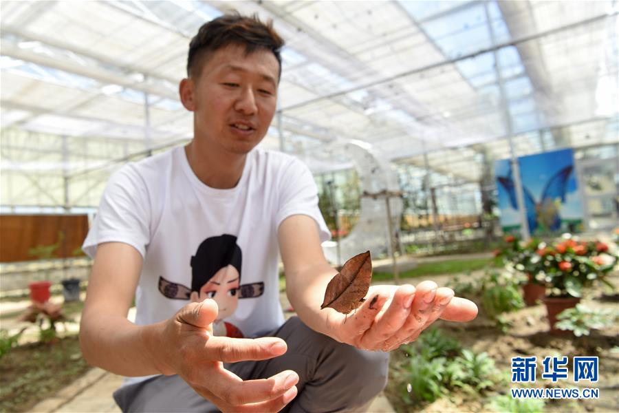 在吉木薩爾縣七彩蝶園,關富云向游客介紹養殖的枯葉蝶(5月15日攝)。新華社記者丁磊攝