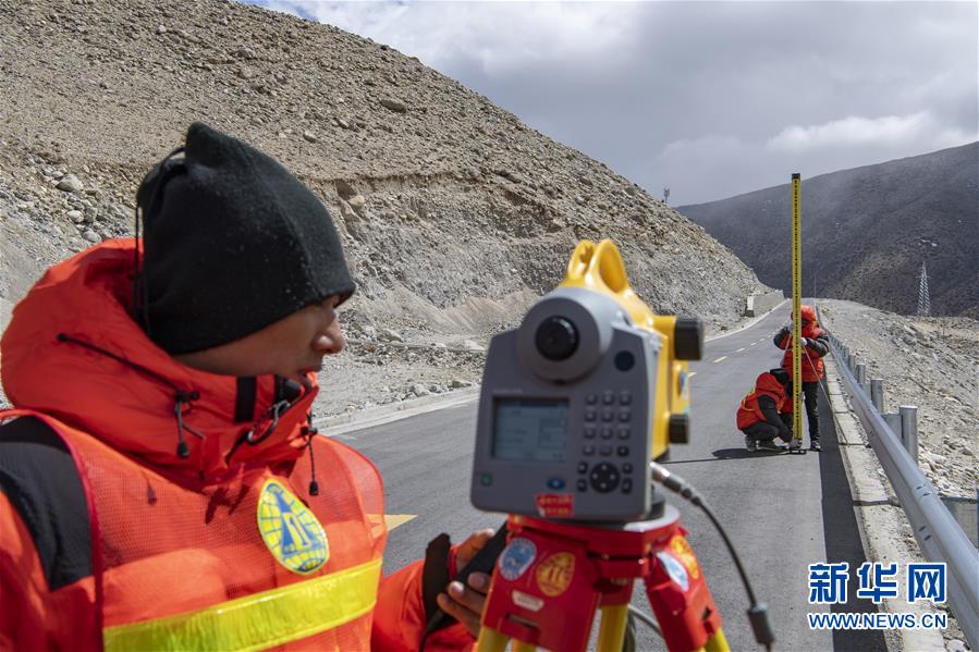 國測一大隊隊員在日喀則市定日縣曲當鄉境內進行水準測量(4月18日攝)。新華社記者孫非攝