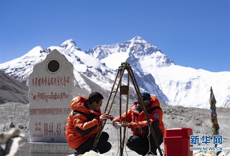 國測一大隊隊員在珠峰大本營附近測試設備(5月17日攝)。新華社記者普布扎西攝