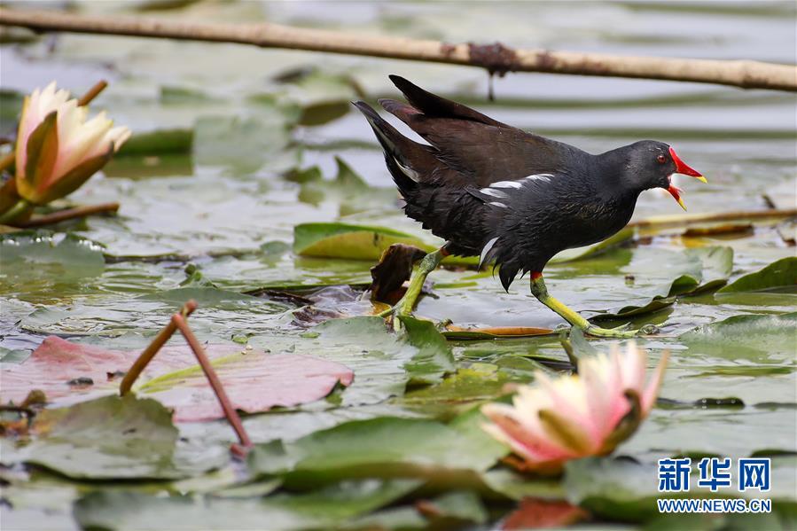 5月22日,一只紅嘴水雞在蓮葉間行走。近日,貴陽市觀山湖公園內大片盛開的蓮花吸引了不少水鳥在其間嬉戲覓食。新華社記者劉續攝