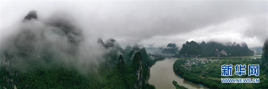 這是在廣西桂林市陽朔縣興坪鎮拍攝的山水風光(5月21日攝,無人機全景照片)。“蒼蒼森八桂,茲地在湘南。江作青羅帶,山如碧玉篸……”一千多年前,唐朝詩人韓愈寫盡桂林山水之美。初夏時節,在廣西桂林市陽朔縣興坪鎮,藍天白云下,煙雨朦朧中,桂林山水盡顯秀美。新華社記者 周華 攝