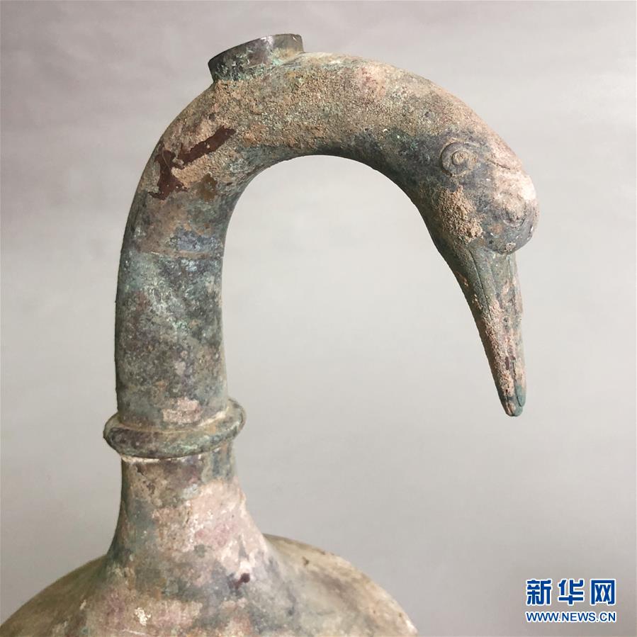 發掘出土的鵝首曲頸青銅壺(5月22日攝)。新華社記者李麗靜攝