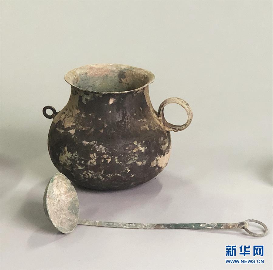 發掘出土的銅鍪與銅勺(5月22日攝)。新華社記者李麗靜攝