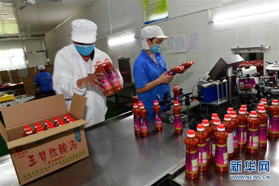 5月26日,工人在貴州省黔東南苗族侗族自治州麻江縣明洋食品公司生產車間灌裝古法酸湯。新華社記者楊楹攝