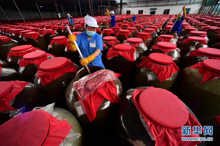 5月26日,工人在貴州省黔東南苗族侗族自治州麻江縣明洋食品公司生產車間攪拌釀造過程中的酸湯原料。
