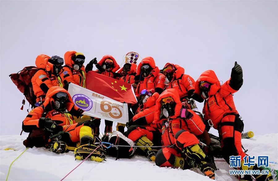 5月27日,2020珠峰高程測量登山隊在峰頂合影留念。