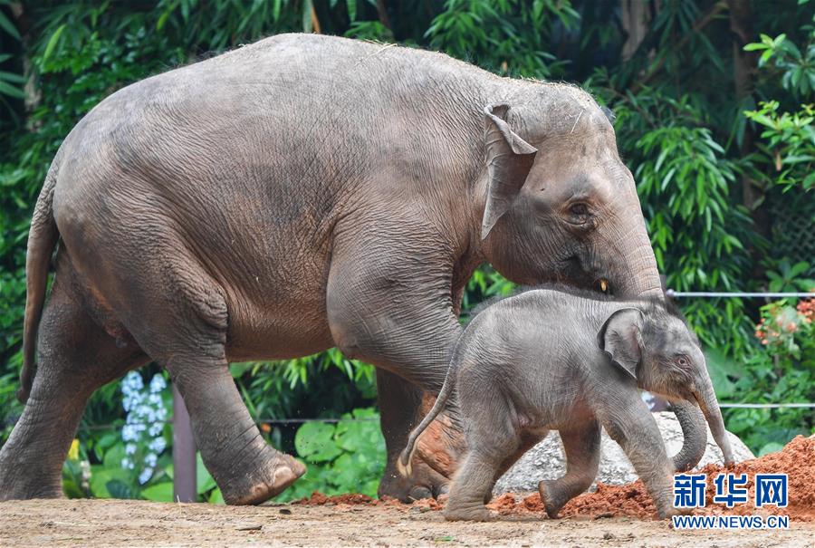 5月27日,廣州長(zhǎng)隆的新生亞洲象寶寶與媽媽寸步不離。新華社記者劉大偉攝
