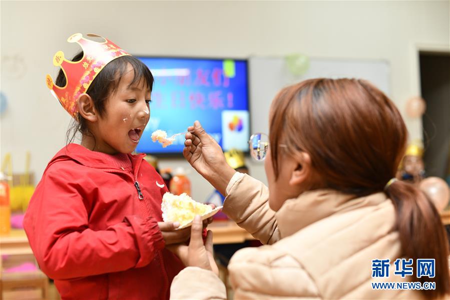 5月27日,玉麥鄉小學的老師給孩子喂蛋糕。新華社記者王炳坤攝