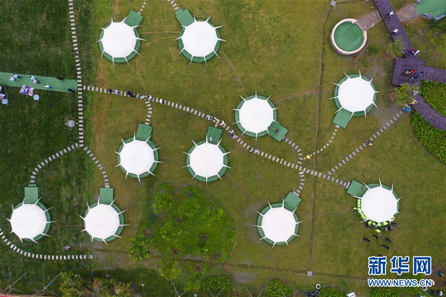 5月31日,空中俯瞰石淙花海內的帳篷露營區(無人機照片)。新華社記者徐昱攝