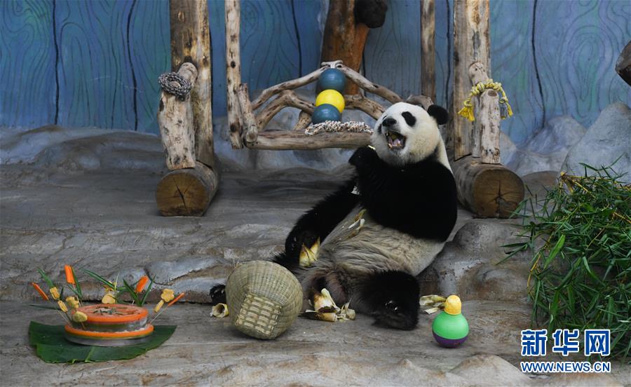 當日是“六一”國際兒童節,海南熱帶野生動植物園為園區內的大熊貓“貢貢”“舜舜”準備了美食和玩具,與小朋友們一同歡度節日。