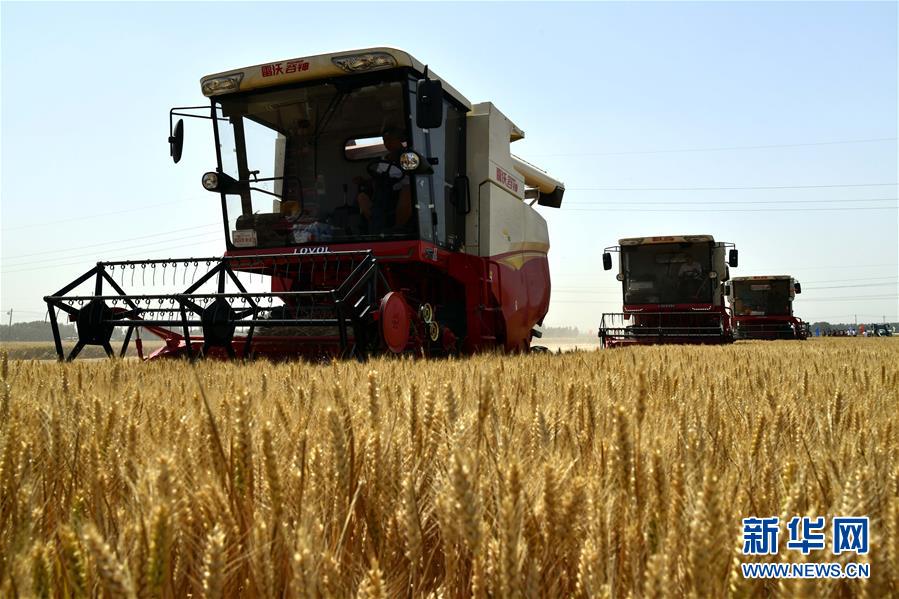 6月3日,在汶上縣郭倉鎮,收割機在收獲小麥。目前,我國第二大小麥主產區山東6000多萬畝小麥進入收獲階段。農民們搶抓有利天氣,自南向北陸續開鐮。新華社記者郭緒雷攝。