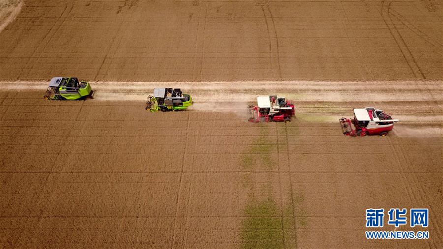 6月3日,在汶上縣郭倉鎮,收割機在收獲小麥(無人機航拍)。目前,我國第二大小麥主產區山東6000多萬畝小麥進入收獲階段。農民們搶抓有利天氣,自南向北陸續開鐮。新華社記者郭緒雷攝。