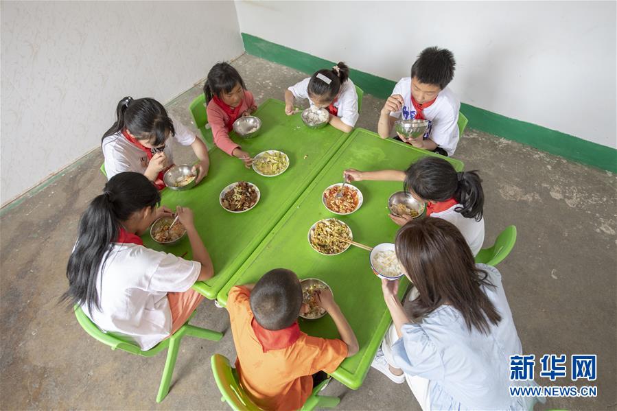 6月2日,馬武寨寄宿制小學的學生們和老師在食堂內吃飯。新華社記者楊晨光攝。