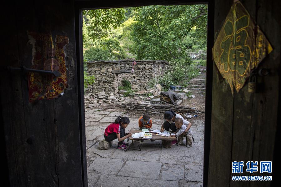 馬武寨寄宿制小學語文老師崔連瑞(左二)和校長趙金成在南背村三姐弟的家里為孩子們輔導功課(5月31日攝)。新華社記者楊晨光攝。