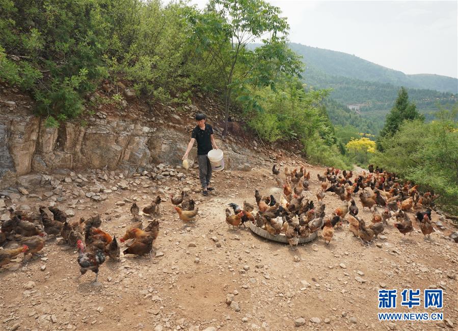 6月4日,唐山市豐潤區火石營鎮趙莊子村百草坡農產品農民專業合作社社員在生態農業園給散養雞喂食。新華社記者郭雅茹攝。