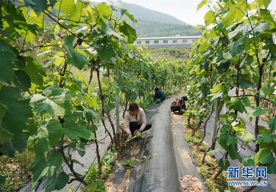 6月4日,唐山市豐潤區火石營鎮趙莊子村百草坡農產品農民專業合作社社員在生態農業園給葡萄藤除草。新華社記者郭雅茹攝。