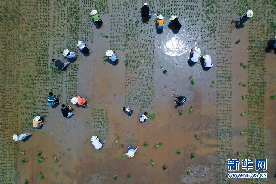 6月7日,孩子和家長(zhǎng)們?cè)隗w驗(yàn)稻田插秧(無(wú)人機(jī)照片)。新華社記者徐昱攝