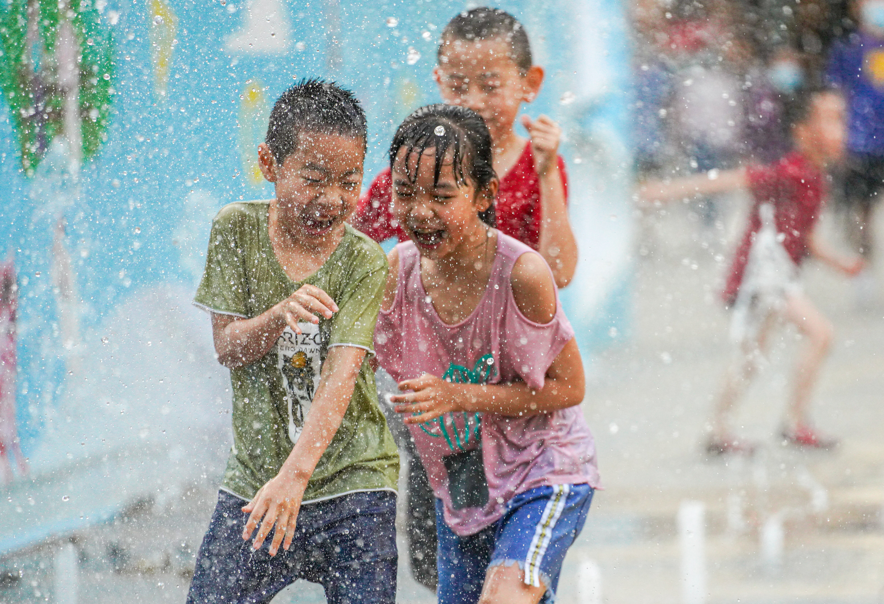 2020年6月9日報道,近期,今年以來最大范圍高溫天氣“炙烤”北方,多地高溫屢創紀錄,中央氣象臺已連續3天發布高溫預警,同時,高溫少雨也導致一些地區出現嚴重旱情。圖為2020年6月4日,北京三里屯噴泉廣場,很多孩子聚集在此,水中玩耍異常火爆。