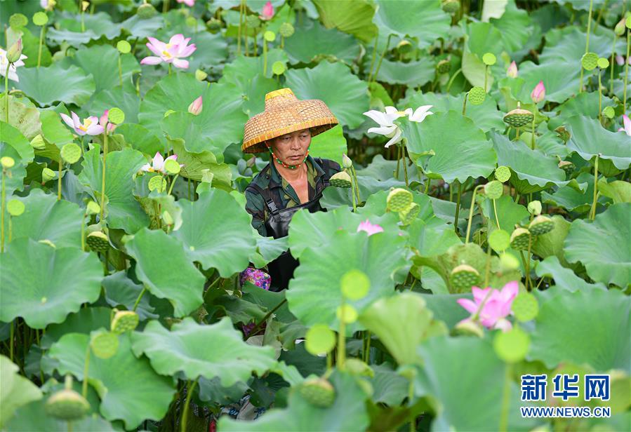 6月9日,村民在海口龍華區龍泉鎮美仁坡村采摘蓮蓬。初夏時節,位于海南海口龍華區龍泉鎮的蓮蓬逐漸成熟,當地村民加緊采摘,一派繁忙景象。新華社記者蒲曉旭攝