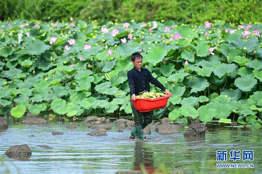 6月9日,村民在海口龍華區龍泉鎮美仁坡村采摘蓮蓬。初夏時節,位于海南海口龍華區龍泉鎮的蓮蓬逐漸成熟,當地村民加緊采摘,一派繁忙景象。新華社記者蒲曉旭攝