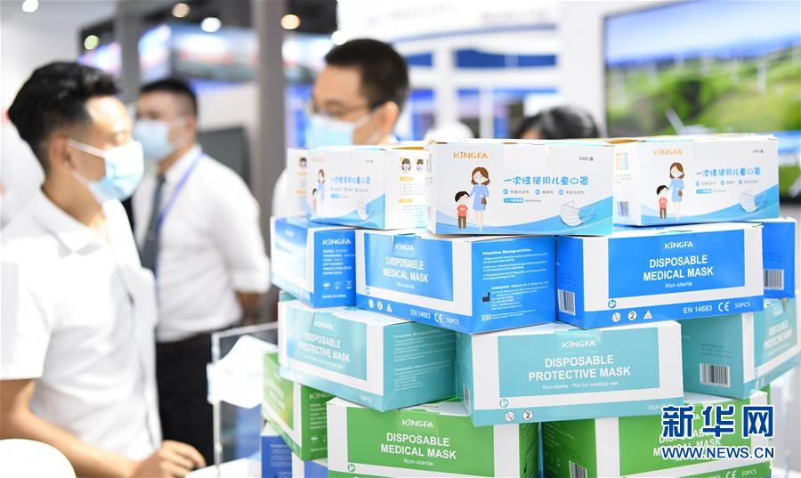 6月10日拍攝的展會上的口罩生產商展位。當日,廣州國際防疫物資展覽會在保利世貿博覽館舉行。本次展會面積共計3.6萬平方米,設有防疫產品、設備、綜合服務、原輔料等4個展區,參展企業約600家。新華社記者鄧華攝