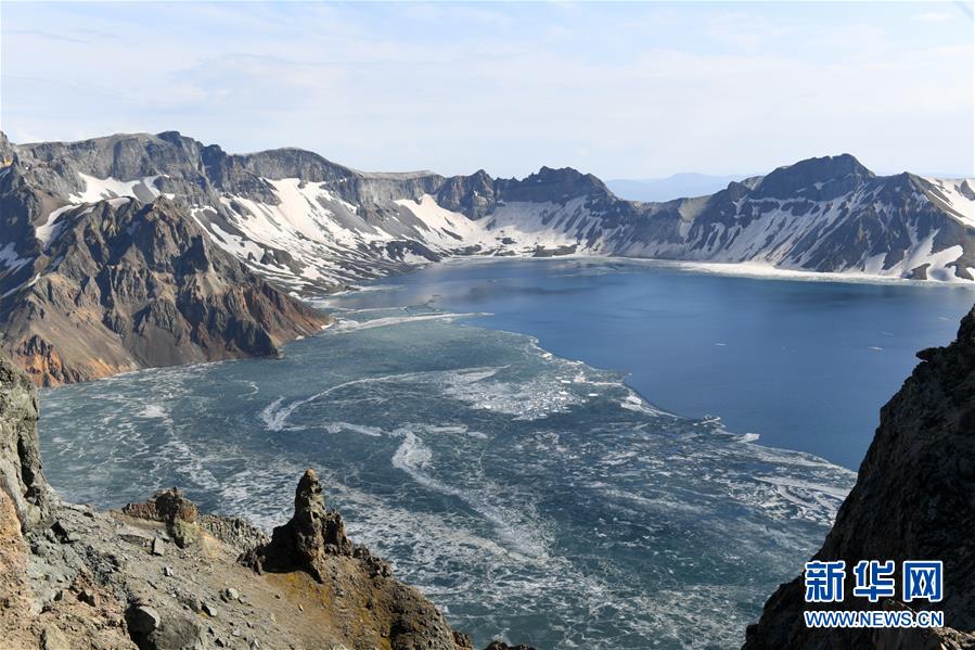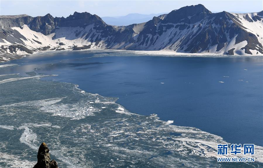 這是6月12日拍攝的長白山天池。近日,長白山天池冰層逐漸消融,迎來“開冰季”。新華社記者 林宏 攝